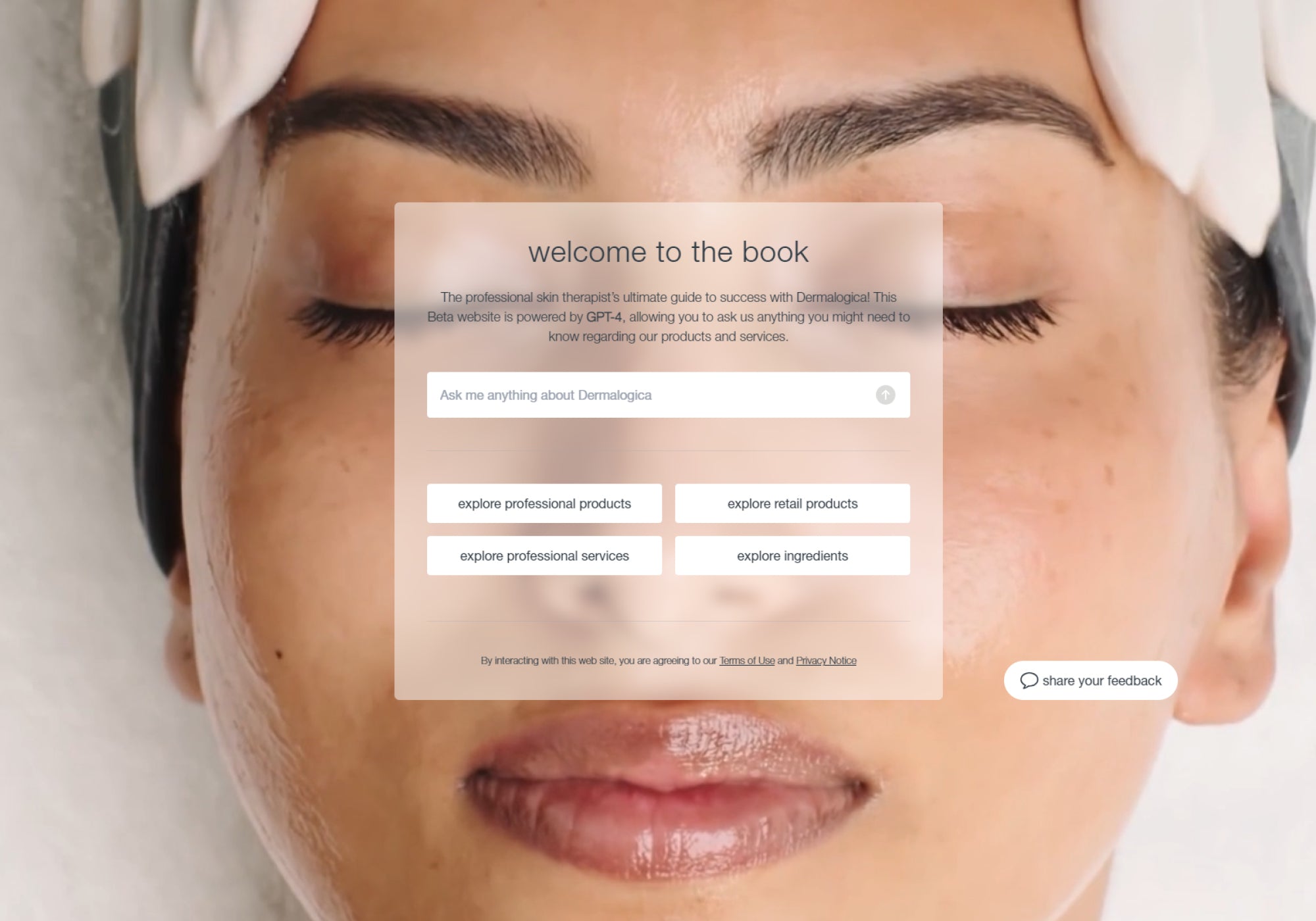 Den ultimative guide til at opnå succes med Dermalogica! The book er et Beta-websted drevet af GPT-4, så du kan spørge om alt, hvad du måtte have brug for at vide om vores produkter og tjenester.